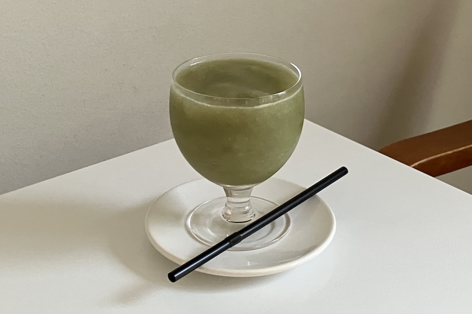 滑らかなテクスチャーのスムージー。ピーチ、マンゴー、マスカット、メロン、ストロベリー、緑の野菜(写真上)の5種類。