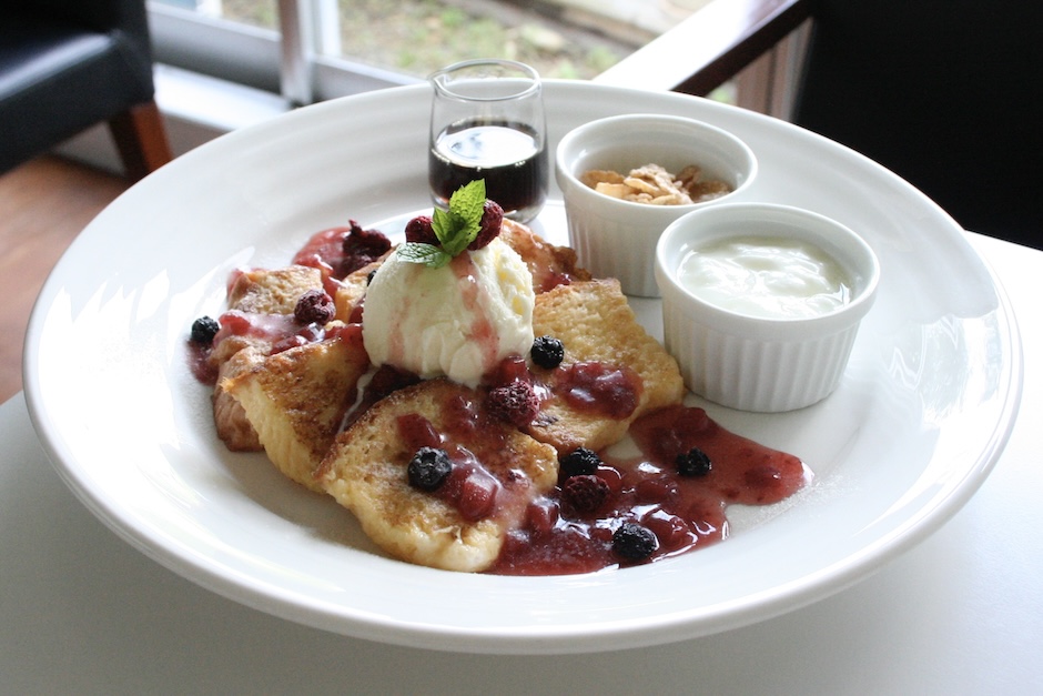 自家製食パンを使った、しっとりふわふわフレンチトースト。フレンチトースト、バニラアイス、シリアル、シロップのプレート。