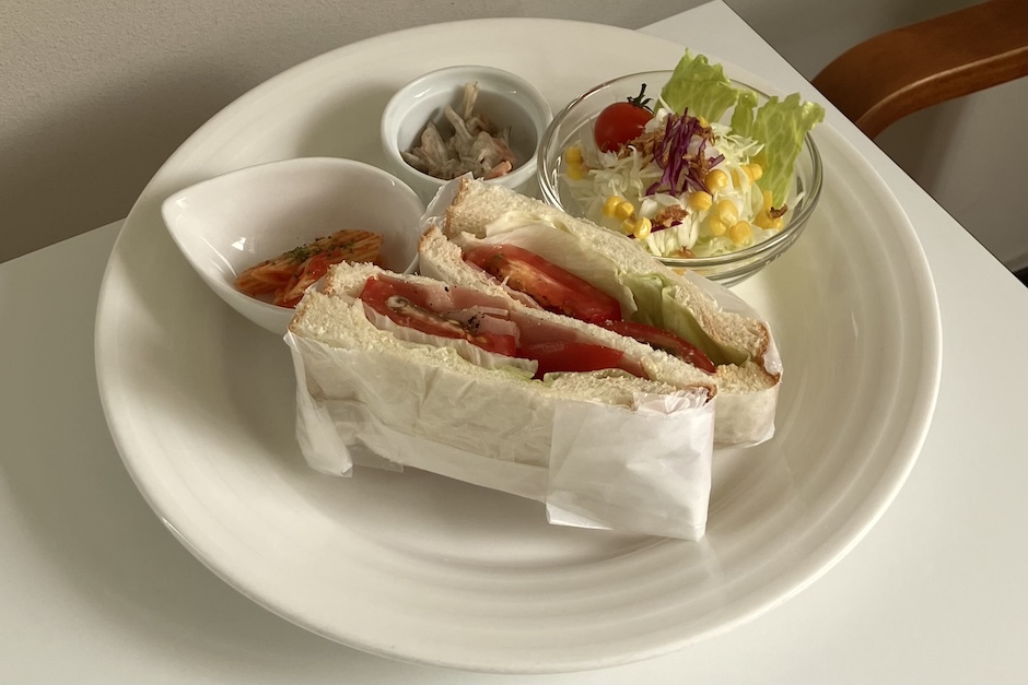 自家製パンのサンドウィッチ。サンドウィッチとデリ2品、サラダのプレート。