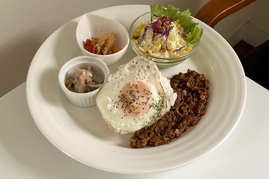 しっかりごはんのドライカレー(中辛)。ごはんとおかず、デリ2品、サラダのプレート。