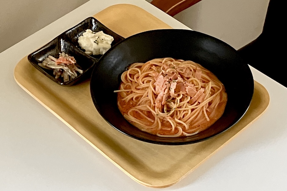もっちりおいしいパスタ。パスタとデリ2品のプレート。