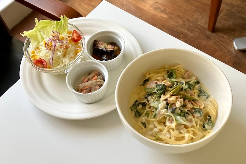 もっちりおいしいパスタ。パスタとデリ2品のプレート。