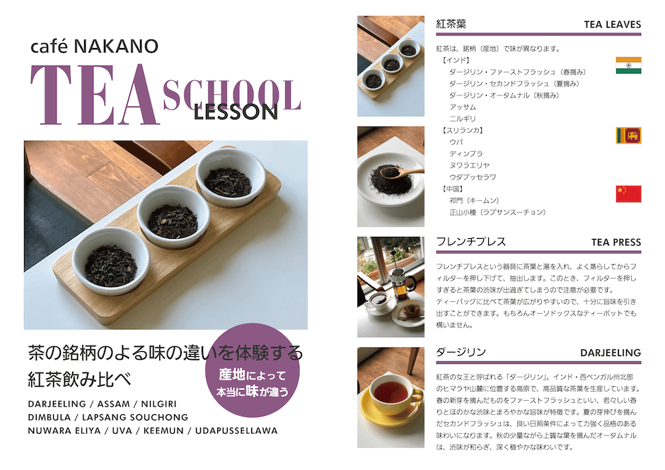 飲み比べの紅茶の淹れ方はフレンチプレスで、すべてバリスタがご用意します。なお、淹れ方のレッスンは行いません。
